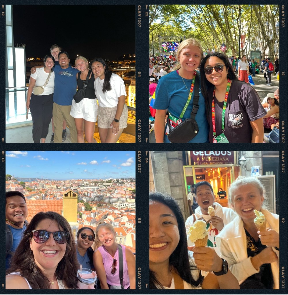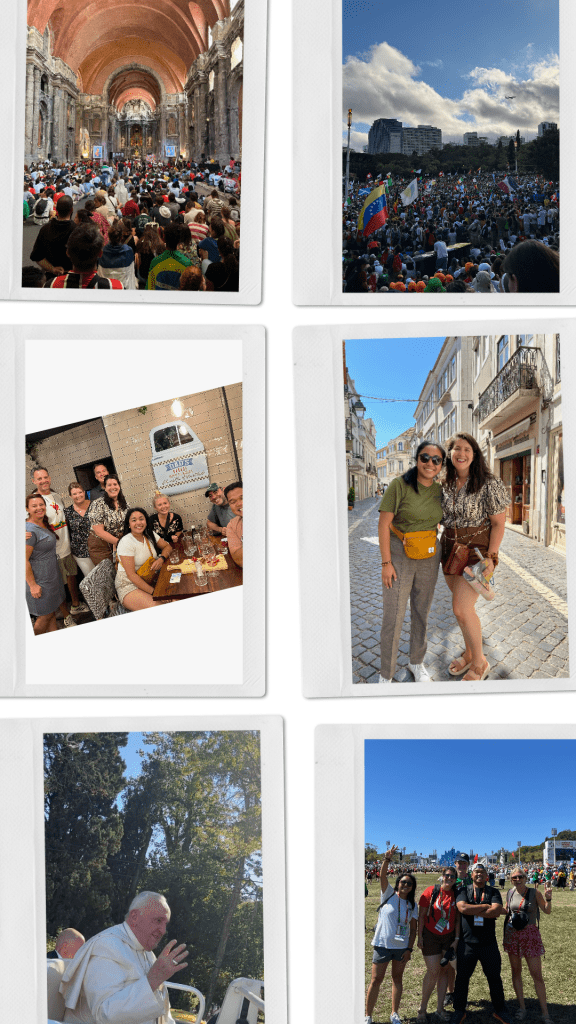 But there was one encounter that struck me the most. We were sitting in a field preparing for the USA Kick Off Gathering (Bishop Barron/Adoration time). Again, due to there being 1.5 million people in attendance, we showed up 3 hours earlier to save some spots. There was a group behind me wearing “Jesuit” shirts. There’s a Jesuits high school in Tampa where I knew some YFC friends had attended. I asked the group if they’re from Florida and they said they weren’t but their youth minister was. It was so loud, I could barely hear them telling me this. I stood up to use the restroom and when I looked up, my long time friend, former leader, and fellow Floridian was standing before me — Seminarian Jeff Miraflor. I hadn’t bothered to message anyone from YFC I was going to Portugal because the odds of us all running into each other was slim to none — or I thought it was. The man who was called to the priesthood and left Florida to pursue his calling. The man I hadn’t seen since 2019. I’m near to tears as anyone who knows me well, knows the prominent role YFC had played in my life. And a piece of home was right in front of me.