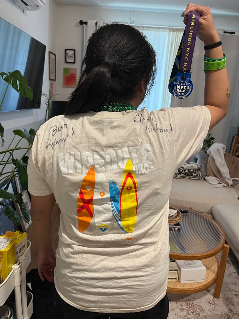 This was my first half marathon, and it was rewarding to prove to myself I’m capable of anything I put my mind to. There were so many challenges — the elevation on the course, my knees and calves becoming tight, having to take walking breaks, my AirPods dying at mile 11, my morning commuting to the race from Grand Central Station to Brooklyn, my inconsistent training plan — but in the hardest moments I told myself “Don’t give up. They’re all waiting for you at the end.”